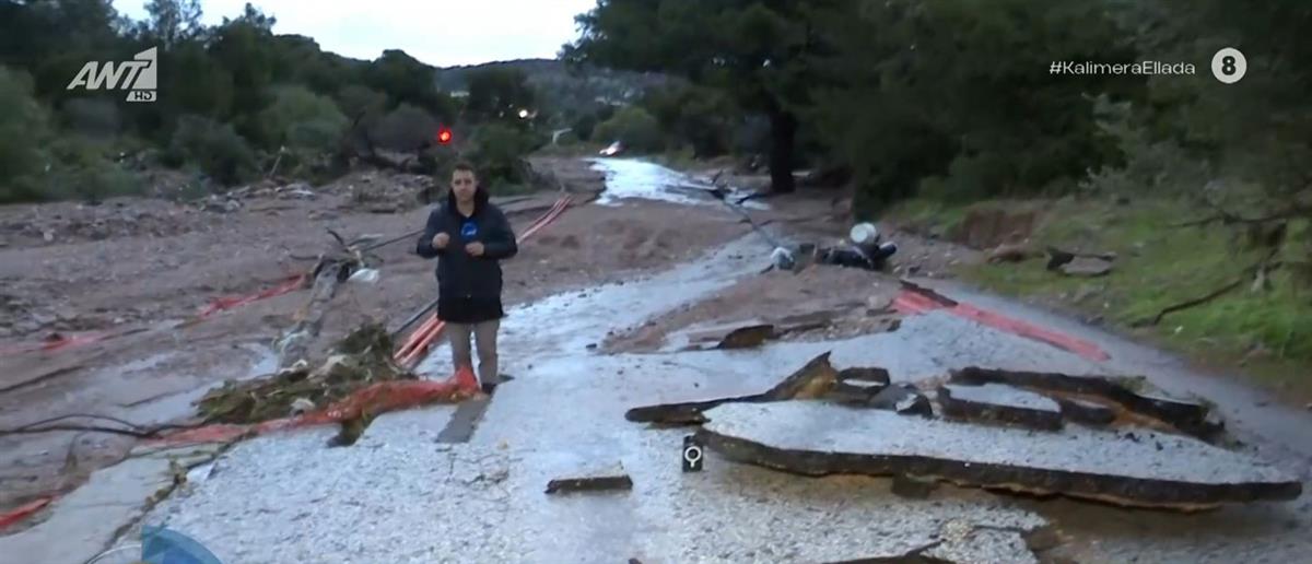 Σύμφωνα με το ρεπορτάζ του Λάζου Μαντικού για την εκπομπή του ΑΝΤ1 "Καλημέρα Ελλάδα", ο χείμαρρος χθες το βράδυ ήταν τόσο ορμητικός που "ξήλωσε" το οδόστρωμα με αποτέλεσμα να "σκάψει" το έδαφος.